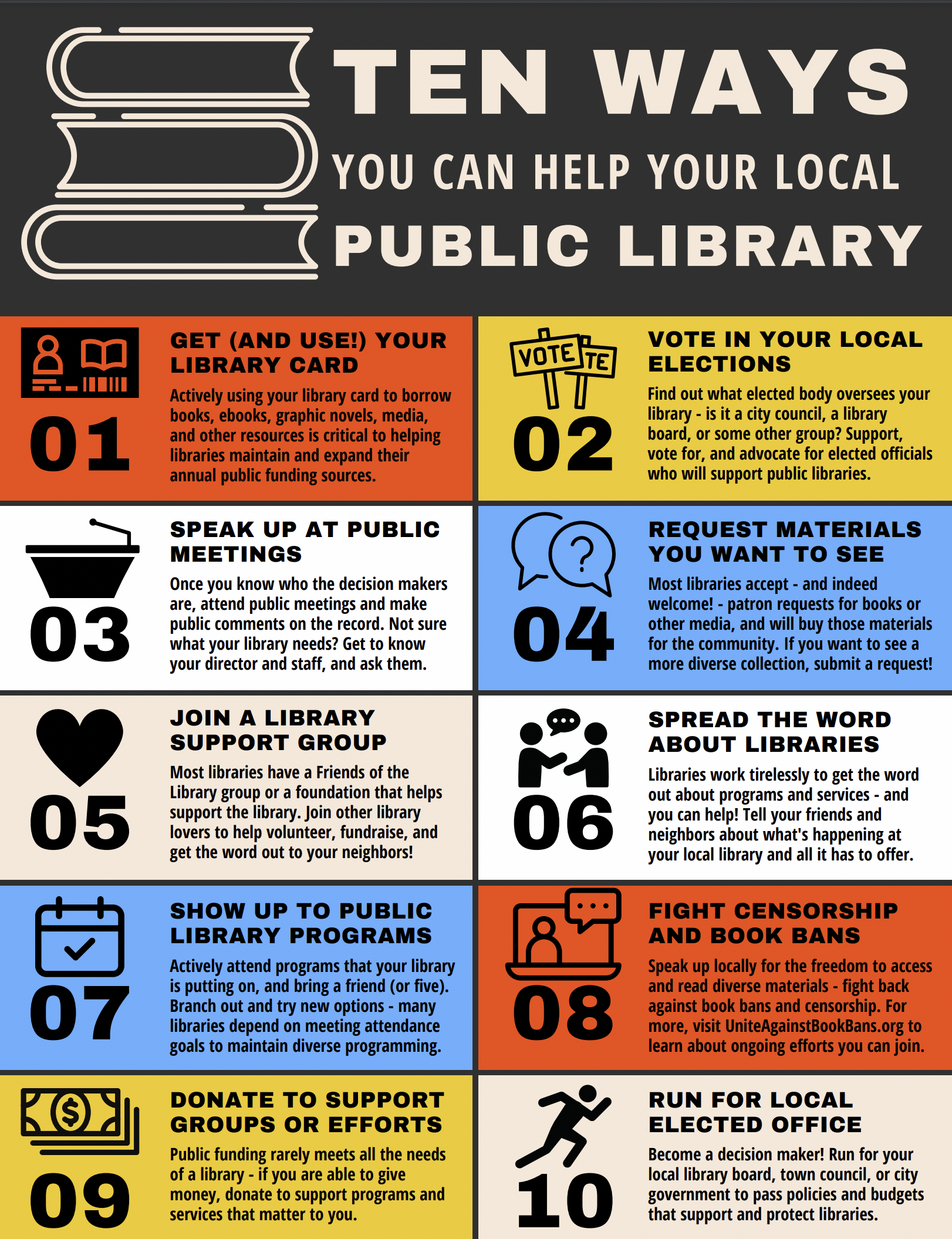 - Make sure everyone in your life knows how important the library is to you so that when local ballot measures come up for library funding (did you know that NINETY PERCENT of library funding happens at the LOCAL level?), your community knows that a vote to increase library funding is good for everyone.