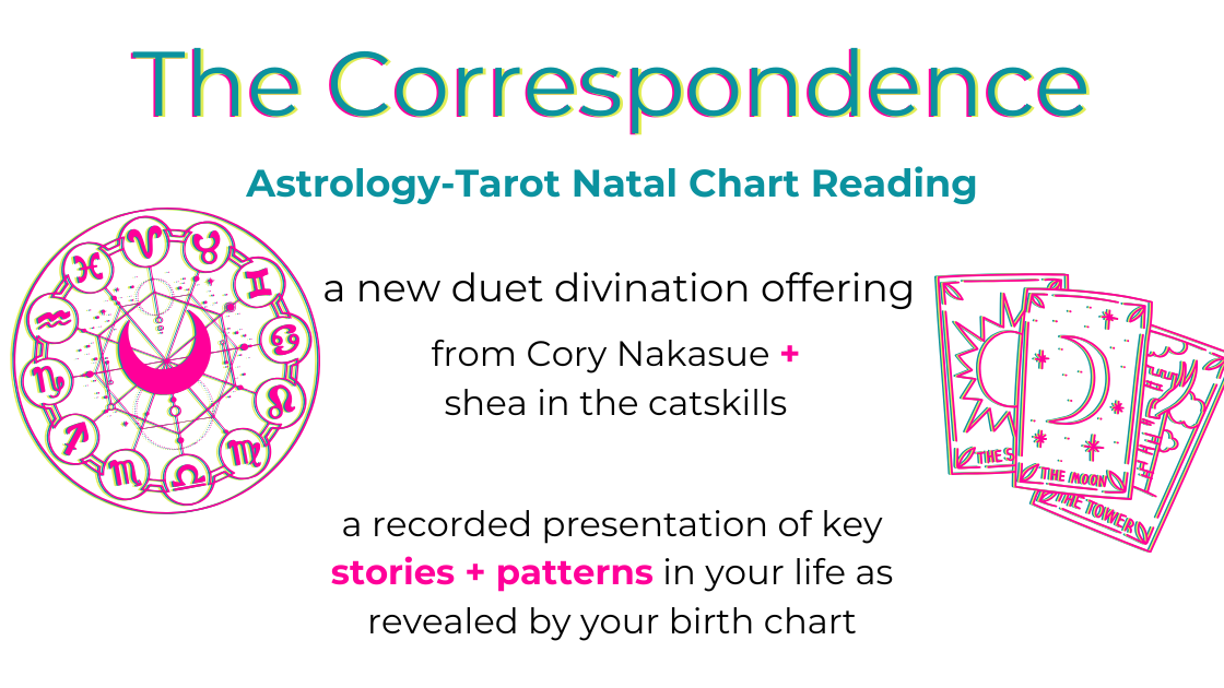 - Cory Nakasue + I are offering a new duet consultation called The Correspondence that presents key stories + patterns in your life as revealed by your birth chart…read what people have said about the experience! We’re also offering Beyond Love + Strife: A Venus Retrograde Workshop in March