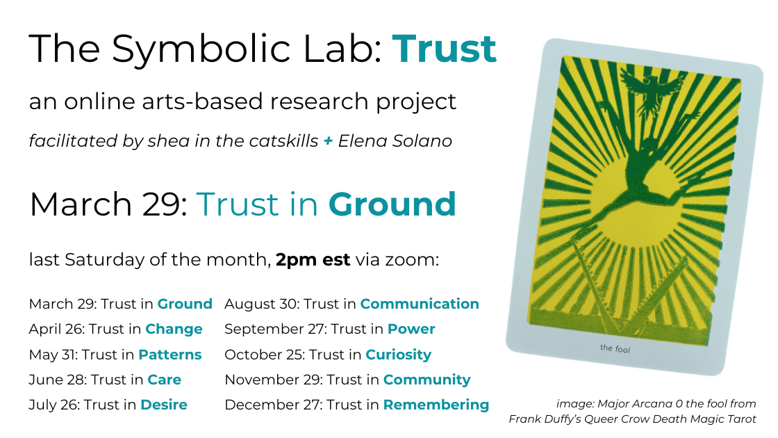 - I’m thrilled to be embarking on a nearly year-long, online arts-based research project with my dear friend + conspirator Elena Solano—The Symbolic Lab: Trust. Join us each month to explore trust thru a theme…