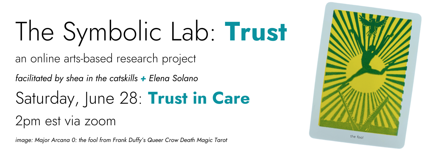 - Elena Solano + I continue our online arts-based research project with Trust in Care Saturday, June 28 at 2pm est. This series is offered by donation, + you don’t have to have attended previous ones to participate. See what participants had to say about it so far…